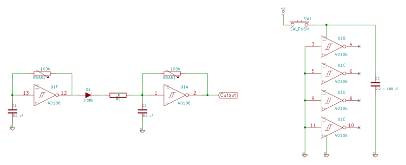Notes: https://2n3904blog.com/cd40106-schmitt-trigger-relaxation-oscillator/
